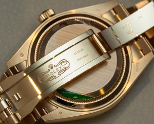 This being Rolex (and not a fancy Daytona or Perpetual 1908), Caliber 9002 is hidden from sight under a solid yellow gold screw-down caseback. This movement made its debut in 2003 with the release of the new-gen Sky-Dweller family, replacing the preceding Caliber 9001. The biggest change between the two calibers is the newest version includes cheap fake Rolex watches patented Chronergy escapement, which according to the brand “combines high energy efficiency with great dependability.” The 72-hour power reserve and 28,800bph rate remain the same as the older movement.