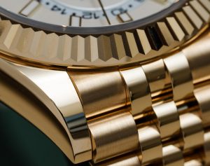 No brand does flashy gold watches quite like Rolex does. How many of us have childhood memories of older relatives wearing a glistening yellow-gold Rolex, understanding that that shiny timepiece signaled something important? For me, it was my grandfather’s cousin, whose gold Day-Date not only entered the room before he did, but because he wore it super loose, it also always had a habit of popping out from whatever kind of sleeves he was sporting that day. I often imagined his watch dropping into the fondue we regularly shared as a family, fishing it out with my cheese-dripping trident, and yelling out the French equivalent of “finders keepers.” I guess watches always took up some space in my brain, even at a young age. Despite all the hyped steel sports watches that Rolex peddles these days, the gold dress pieces are still a massive part of its catalog. And for the brand’s biggest, boldest, and baddest gold dress watch, there’s the Rolex Sky-Dweller. Stepping out for the first time with a matching 18k yellow gold Jubilee bracelet at Watches & Wonders 2024, it’s surprising that it took Rolex this long to marry a yellow Sky-Dweller with its famed bracelet because they’re obviously made for each other. We went hands-on with the yellow gold best replica Rolex Sky-Dweller 336938 watches with a Jubilee bracelet and white dial to review how this modern gold brick stacks up against the Crown’s other yellow precious-metal pieces.